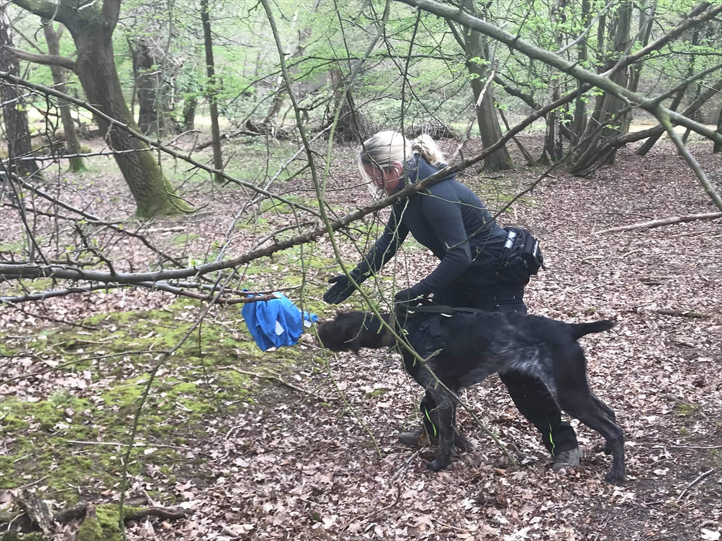 Rufus wurde mit 16 Monaten für den Einsatz als Mantrailer für die Polizei und für den Rettungseinsatz von der Britischen Mantrailing Academy erfolgreich geprüft.
