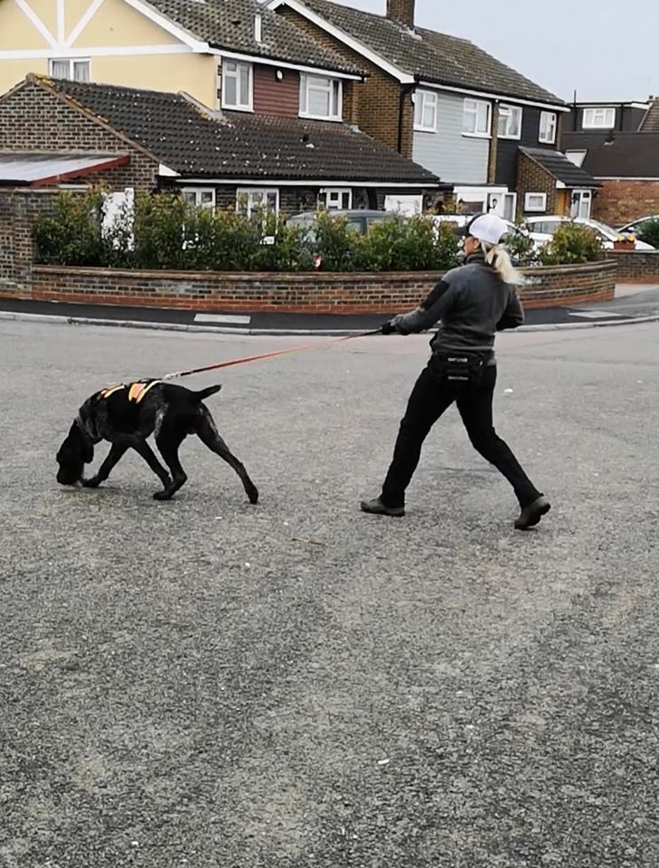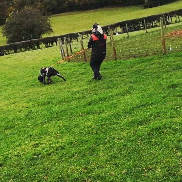 Rufus wurde mit 16 Monaten für den Einsatz als Mantrailer für die Polizei und für den Rettungseinsatz von der Britischen Mantrailing Academy erfolgreich geprüft.